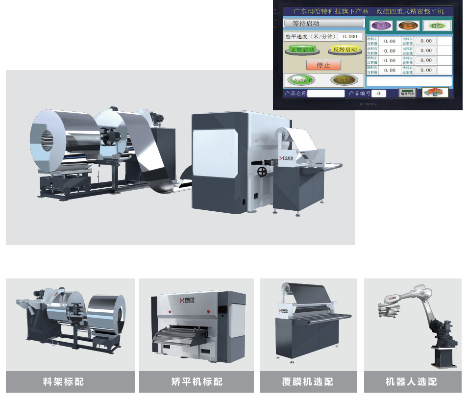 This machine adopts Japan\'s Panasonic PLC controller, which has the function of storing, calling and editing process parameters. It can set the reduction amount of the inlet and outlet according to the parameters such as plate thickness and plate width or the existing parameters in the database, so as to realize the gap between the out and in of the work roll. electric adjustment of Leveling accuracy up to 0.2mm/㎡