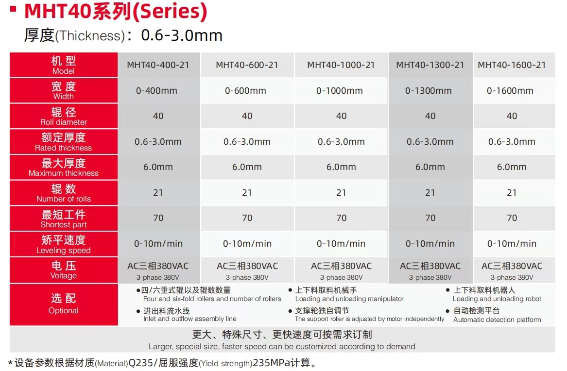 MHT40 数控精密钢板矫平机,是专为钢板金属板带精细校平设计的一款智慧数控全自动校平机,该机型可兼顾0.6-3.0MM厚度范围内金属材料校平,智能数控调节,自动化运作,已操作,上手快,采用精密电机驱动,能耗降低50%,可根据客户需求定制生产,满足不同行业、不同规格的加工需求,同时支持搭配其他设备协同工作。